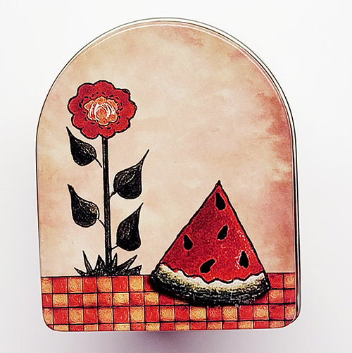Decorative front of tin with a red rose and watermelon slice on a checkered background