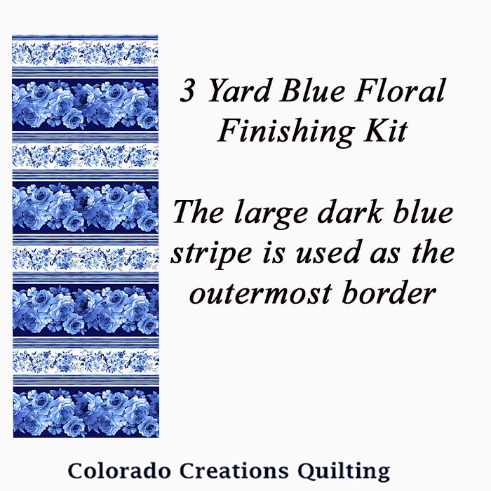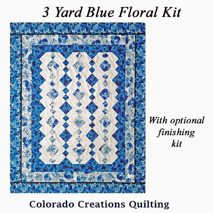The 3-yard quilt kit features one yard of a light and dark blue floral fabric along with white and access to a complimentary pattern with easy to follow directions and great visuals.